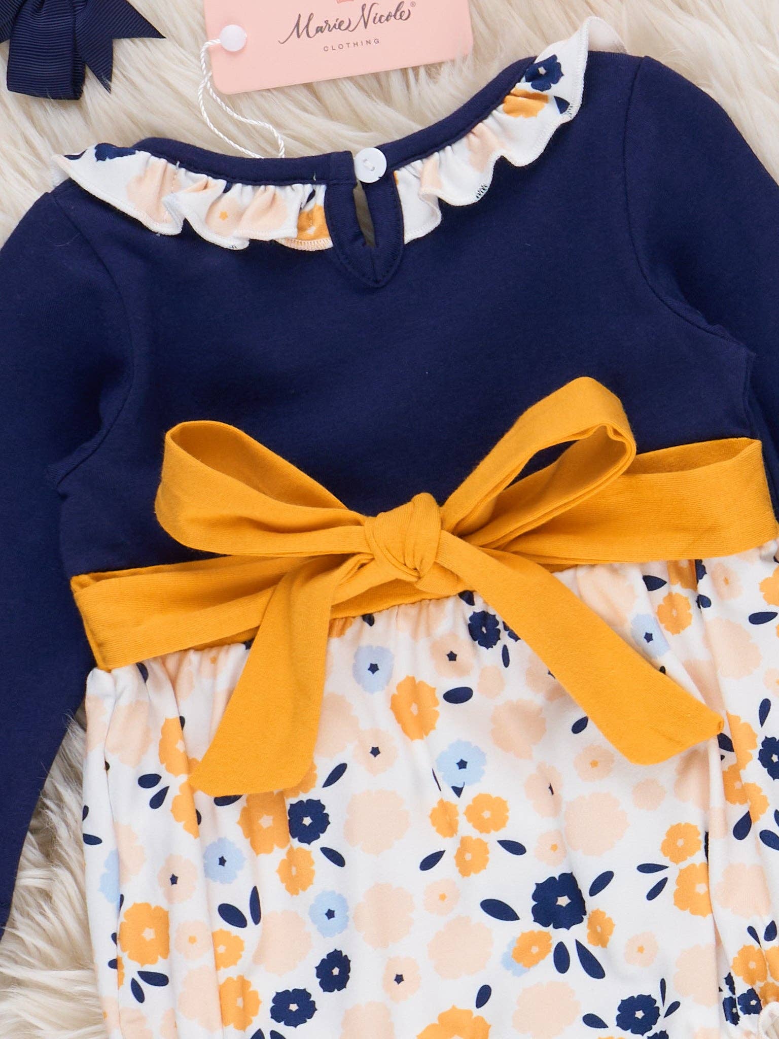 The Midnight Blooms Ruffle Bubble by Marie Nicole features a contrasting long-sleeve bodice with a playful ruffle collar and a gathered bubble bottom adorned with a delightful floral print. Completing the look are sweet pocket details and a comfy elasticized waist and leg openings. * Snap buttons. * Fits true to size. * 95% Polyester / 5% Spandex * Combo: 97% Cotton / 3% Spandex *